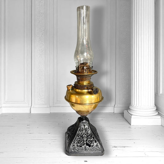 Antique Victorian Oil Lamp Young’s 20 Count Burner, Etched Adam Globe,Cast Iron