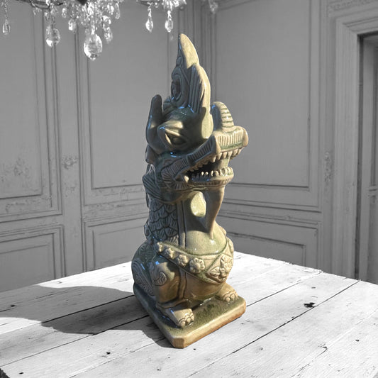 Antique Celadon Temple Guardian Foo Dog Dragon Southeast Asian Architectural Sculpture, 18” Tall