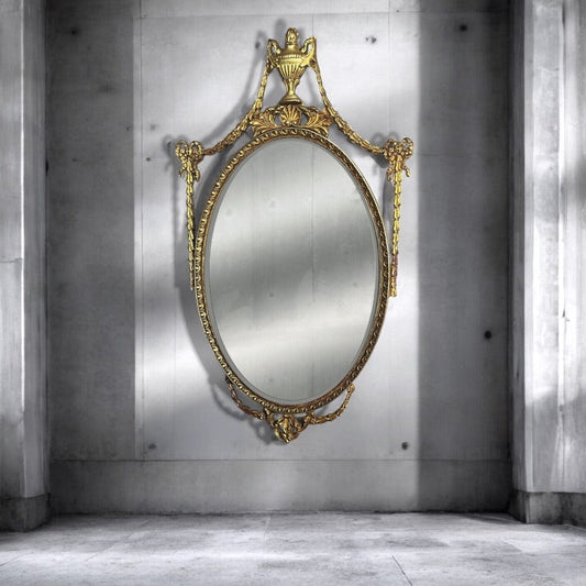Large Antique Regency Adams Style Gilt Decorative Oval Bevelled Mirror.