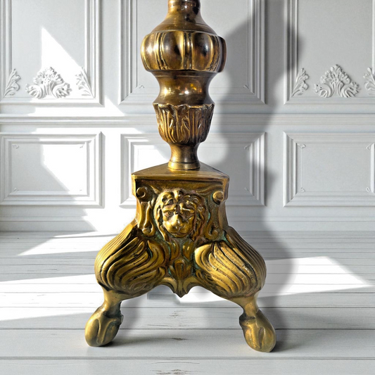 Pair of Antique Brass Candlesticks – Lion Mask & Acanthus Bases – Empire Revival Style c.1880