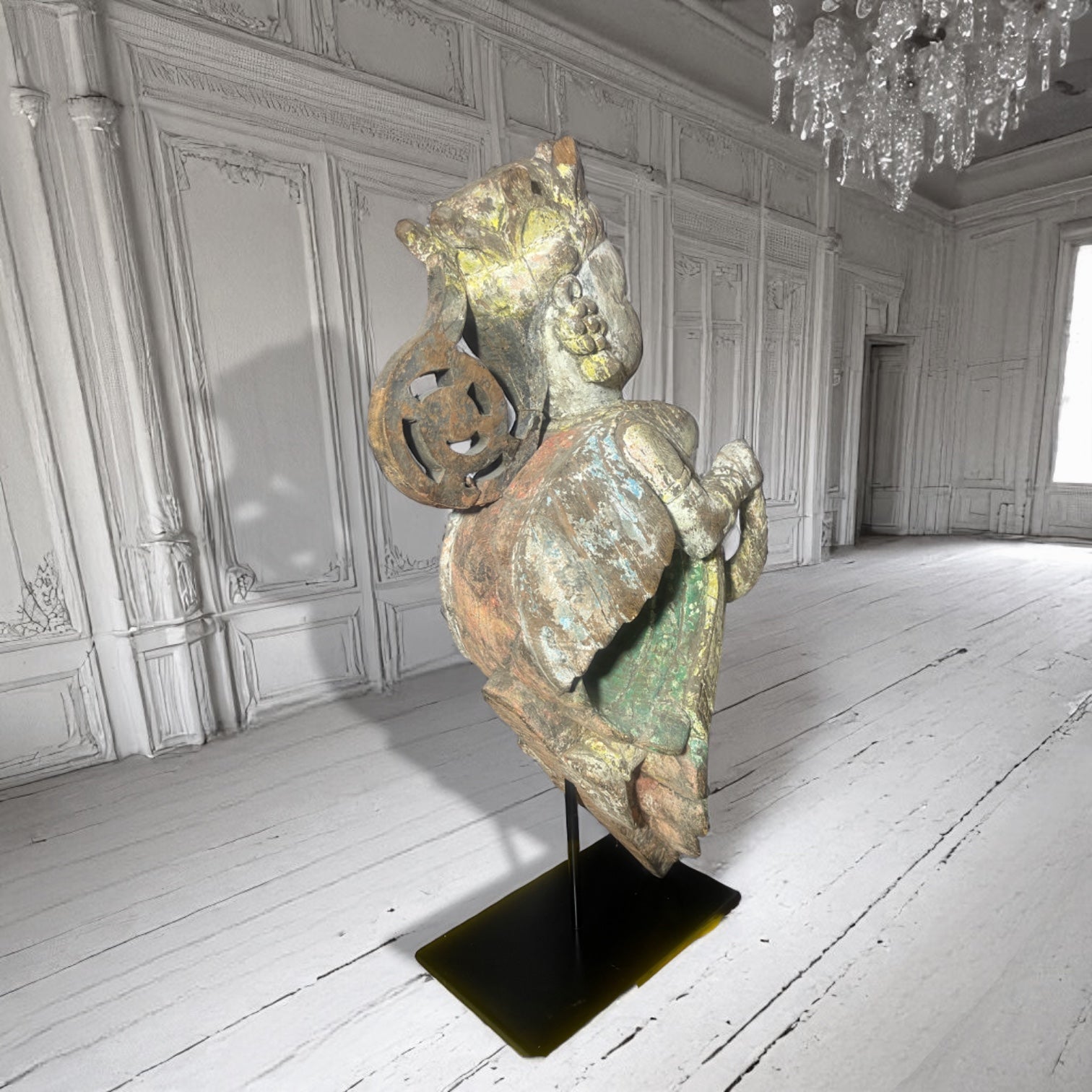 17th century winged angel corbel sculpture from Patan, Gujarat. Hand-carved wood with remains of polychrome paint with aged patina. Measures 25.5"H 7.5" W 11.5" Mounted on a 12" x 12" metal base.