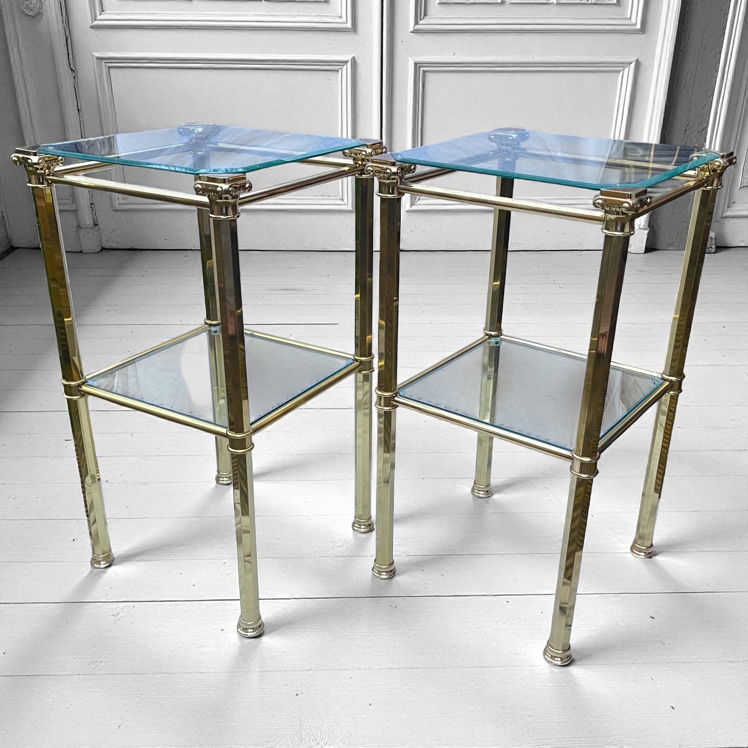 A striking pair of 1970s side tables showcasing the hallmarks of Hollywood Regency design. Each features a thick bevelled-edge glass top and matching lower shelf, supported by octagonal brass tubing in the style of Romeo Rega. The brass retains its warm vintage patina, whilst the glass remains pristine. Substantial and beautifully crafted. Excellent condition. Height 73cm, width 40cm, depth 40cm.