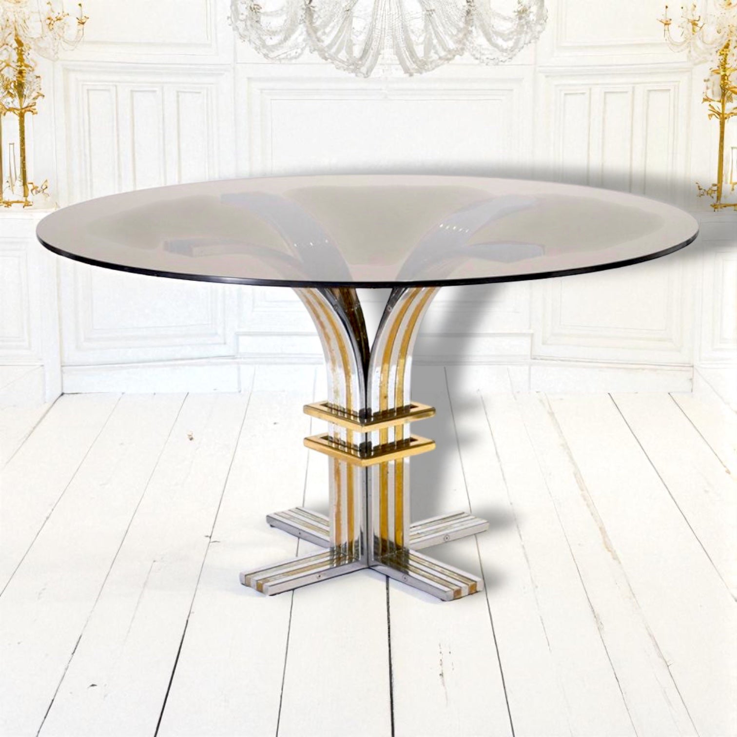 Iconic 1970s Italian dining table by Renato Zevi for Banci Firenze. Sculptural brass and chrome base paired with a substantial round glass top creates timeless elegance. Pristine condition with polished finishes and minimal patina. Seats six.Original brass and chrome plated steel base, highly polished and heavy.