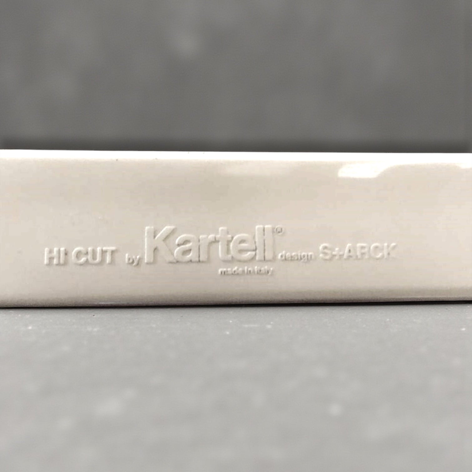 A pair of authentic Kartell Hi-Cut chairs by Philippe Starck and Eugeni Quitllet. Each features a faceted transparent backrest—one violet, one green—with a white polycarbonate seat. Lightweight yet durable, these iconic design pieces are marked "Made in Italy" and suit contemporary interiors perfectly. Seat height 47cm.