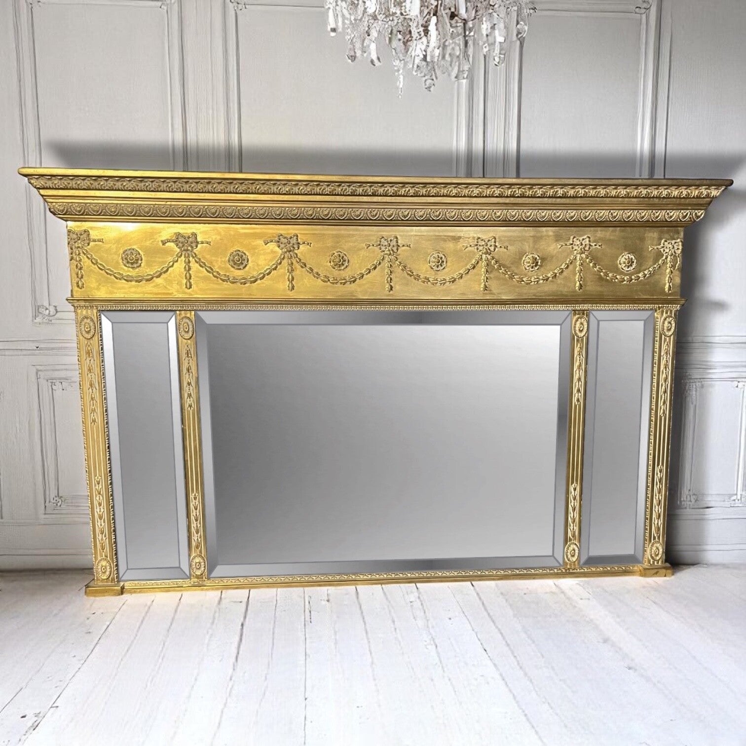 SOLD : Adams Regency Style Large Triple Plate Gilt Over Mantle Bevelled Mirror