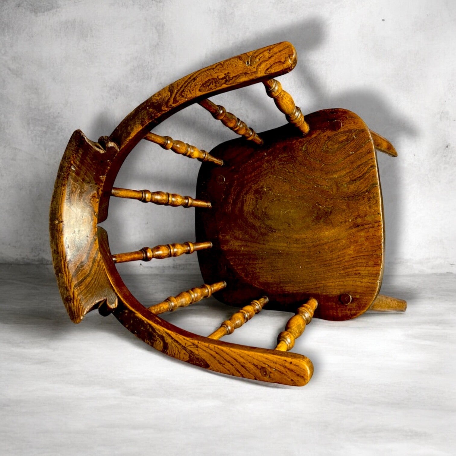 Antique Captain's Bow Oak Seat Smokers Chair Stamped J ELLIOTT & SON. A beautiful example of a late 19th century smoker's bow chair, crafted in solid oak and stamped J Elliot & Sons , an important furniture maker in High Wycombe, England of whom three chair examples are in the collection of The Museum of the Home in London.Features curved backrest, turned spindles, and straight tapered legs with stretcher for strength. Stamped makers mark, fine aged patina, one of the legs at the front has a chip adding to its story. Dimensions: H: 31", W: 24.5", D: 21.5", Arm Rest H: 10.5", Seat H: 17.5".