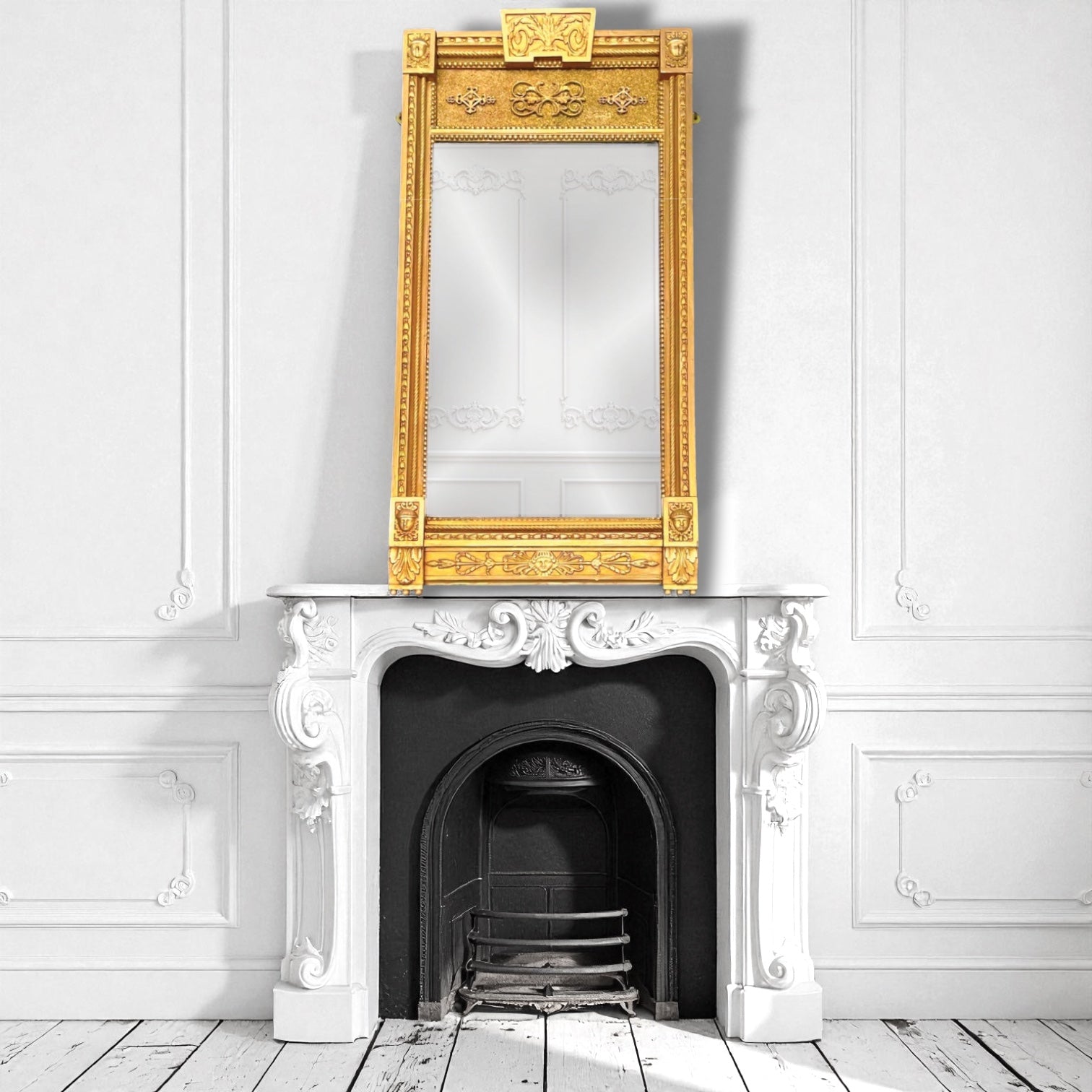 Antique Regency pier mirror from circa 1820–1835, featuring original mercury glass and intricately carved giltwood frame. This neoclassical overmantel displays classical fluted columns, rope moulding, anthemion motifs, and helmeted female masks—hallmarks of the period's finest craftsmanship. The original mercury plate retains its characteristic soft frosting and silver bloom. Solid early 19th-century construction throughout. Height 44 inches, width 22 inches. Perfect for Georgian, Regency, or early Victorian interiors.