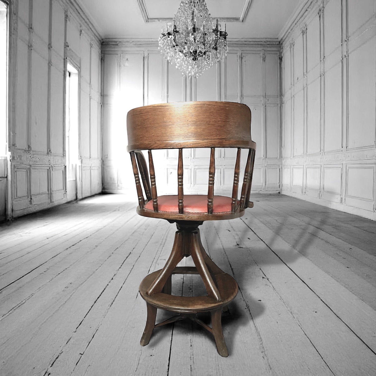 High-quality oak and leather bespoke architects chair in art nouveau style. Adjustable height and hand-carved details. Restored and polished with red leather seat and oak foot rest. H: 29"/27", D: 17", seat H: 24"/26", backrest H: 15", armrest H: 10", footrest H: 9", base leg dimensions: 16". Wear consistent with age.