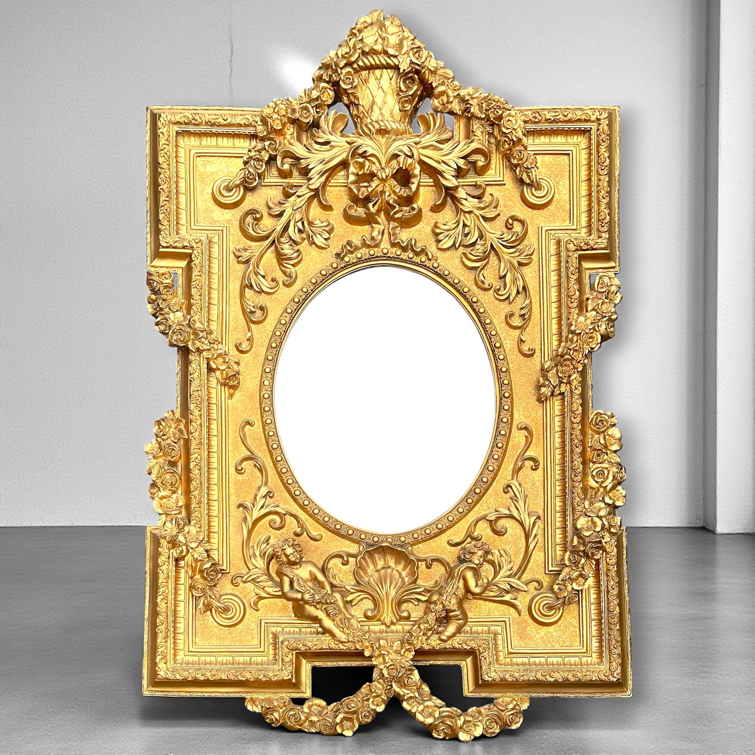 A commanding French Louis XVI-style gilt mirror with intricately carved cherubs, scrollwork, and floral motifs surrounding a beveled oval glass. Premium high quality reproduction delivers authentic weight and presence. Rich gilding with minor patina befitting its character. Structurally sound with pristine mirror plate. At 155 cm × 70 cm, this statement piece elevates grand hallways and formal interiors with classical refinement.