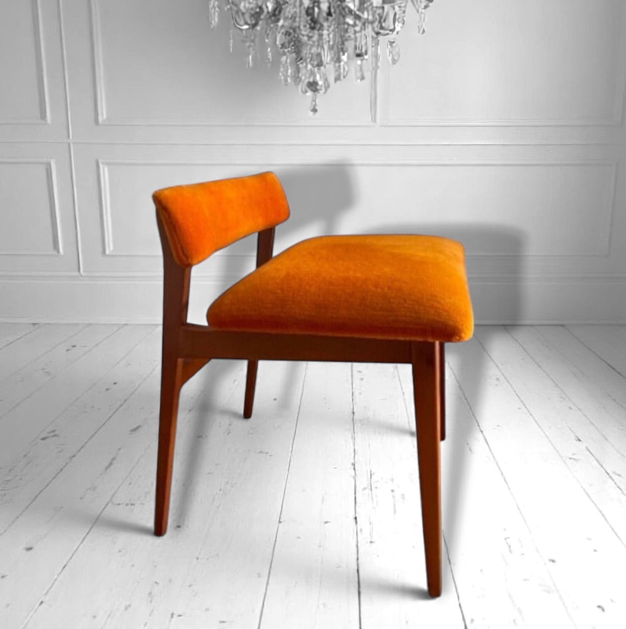 Stylish Danish inspired Mid Century Austin suite teak dressing table and Rare Matching Chair. Features 6 drawers, mirror, and beautiful tangerine plush upholstered fabric on the chair. Dimensions: W154cm x D42cm x H70cm.