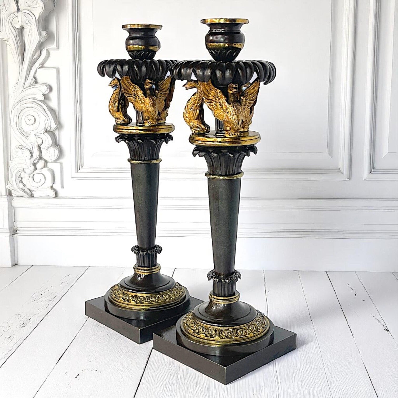 This pair of French Empire candlesticks, circa 1810–1820, is attributed to Claude Galle, a renowned bronzier of the Napoleonic era. Crafted in gilt and patinated bronze, they feature three gilt swans with outstretched wings around the base and a tapering shaft with classical decoration. Originally converted into lamps in the 1930s, they have been professionally restored to their original candle use. These well-preserved antiques retain their original gilding and patina, with no structural damage, making them exceptional examples of early 19th-century French craftsmanship.Three finely cast gilt bronze swans with outstretched wings encircling the base,A tapering patinated shaft with foliate collar and anthemion frieze,A lotus-form drip pans and original candle cup at the top,Internal foundry markings: "4 x 1111" and "327" — consistent with early 19th-century French model registration.Historically converted into lamps in the 1930s (now professionally and discreetly reversed, retaining all original parts).Height: approx. 15 inchesBase width: approx. 6.5 inches