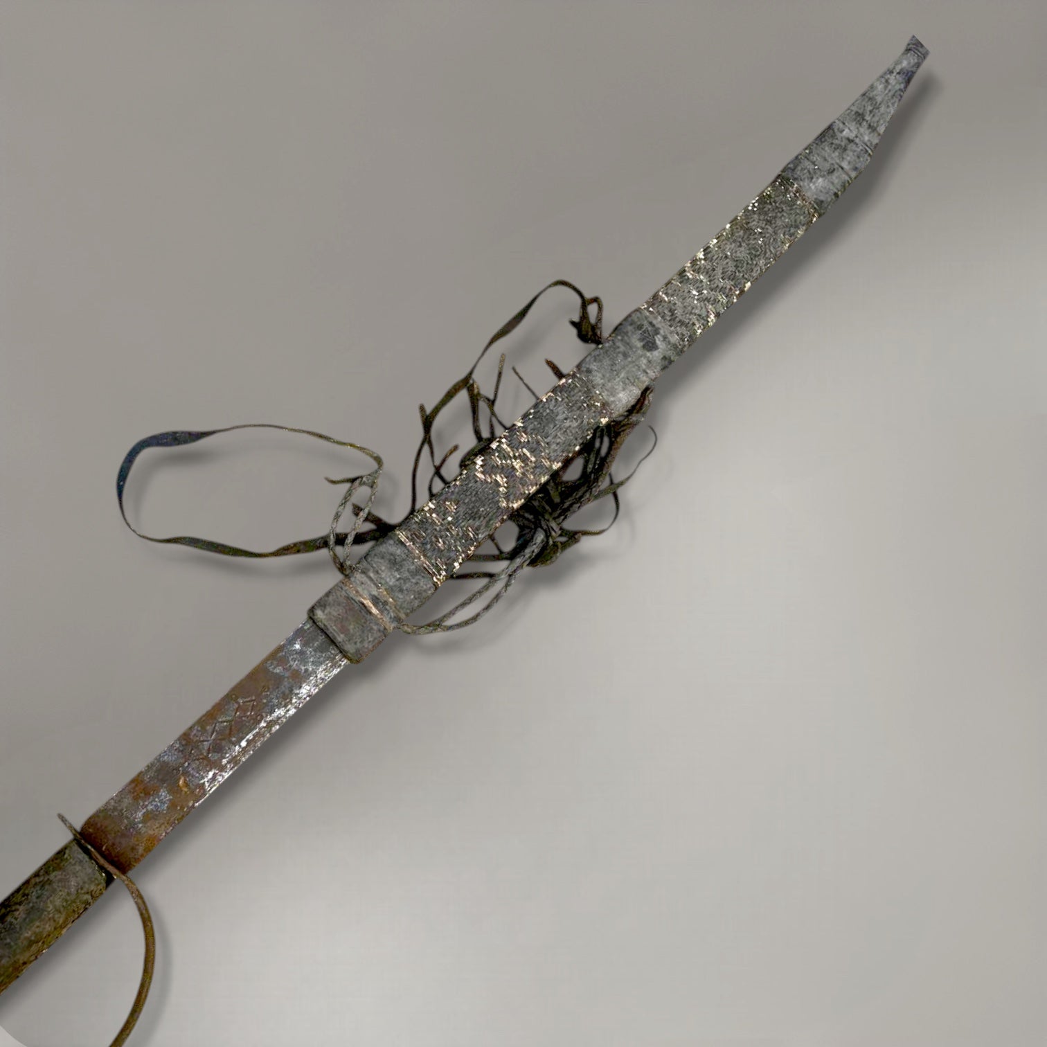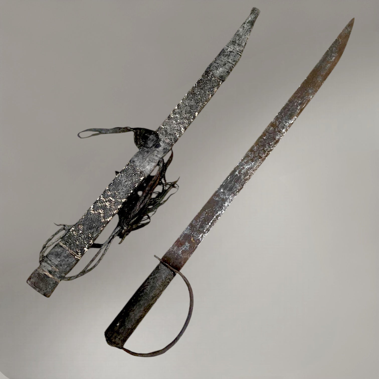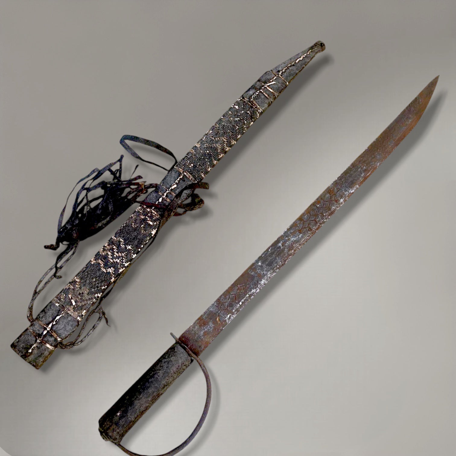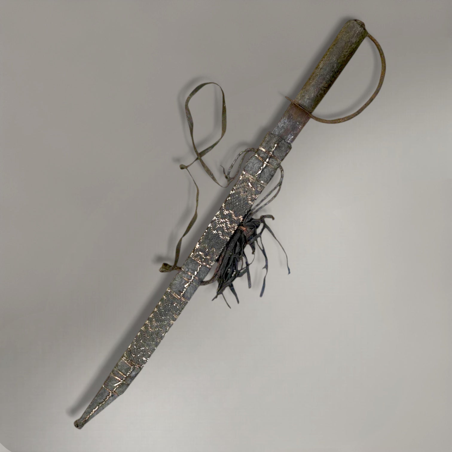 A rare and authentic African prestige sword, dated to c. 1900–30, measuring 76 cm. This example features woven scabbard, geometric blade marks.