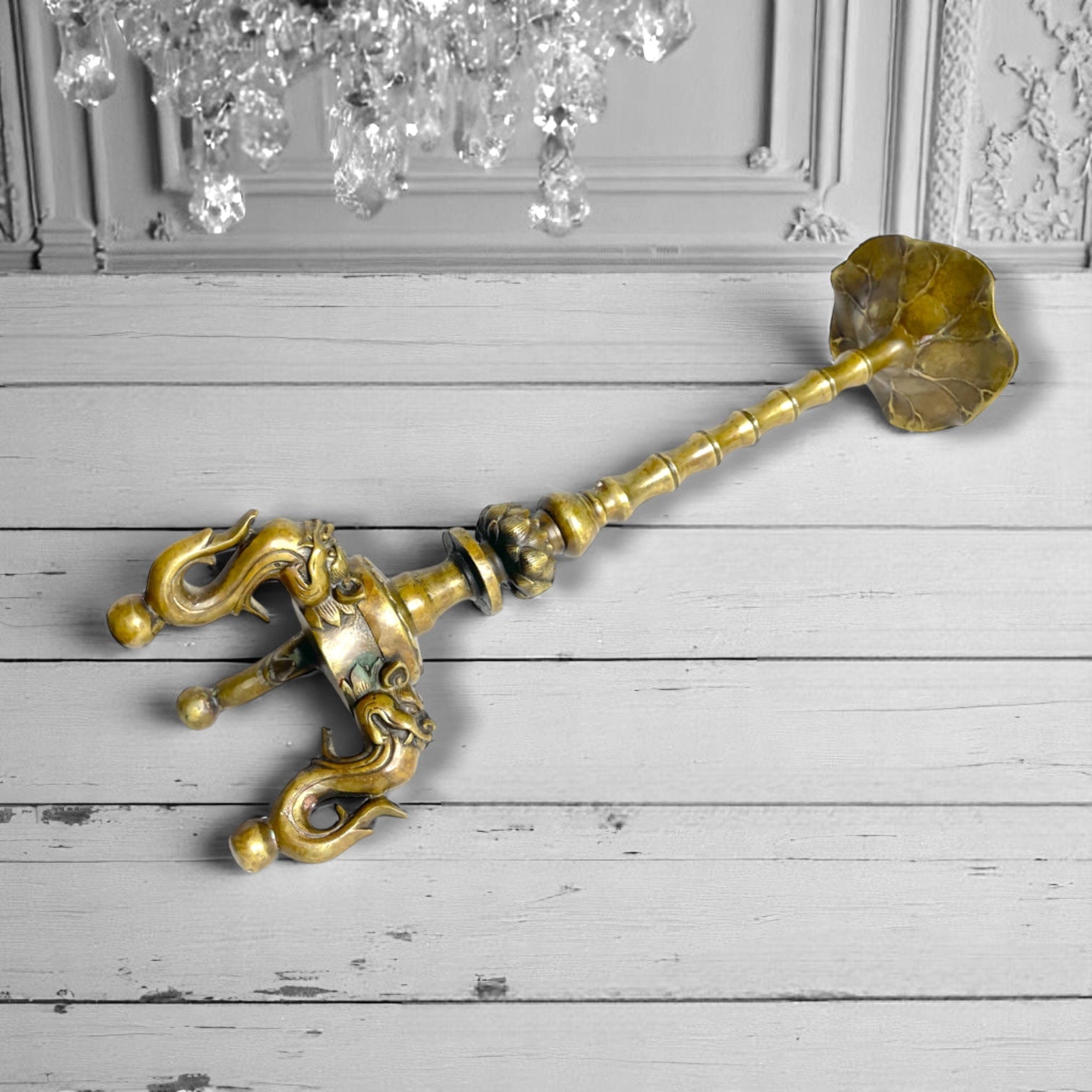Rare Pair Antique Tibetan-Chinese Brass Candlesticks, Frog & Lotus, Dragon Base, c.1880-1920. Hand-crafted with intricate detail and reflecting Tibetan-Chinese artistic influences.