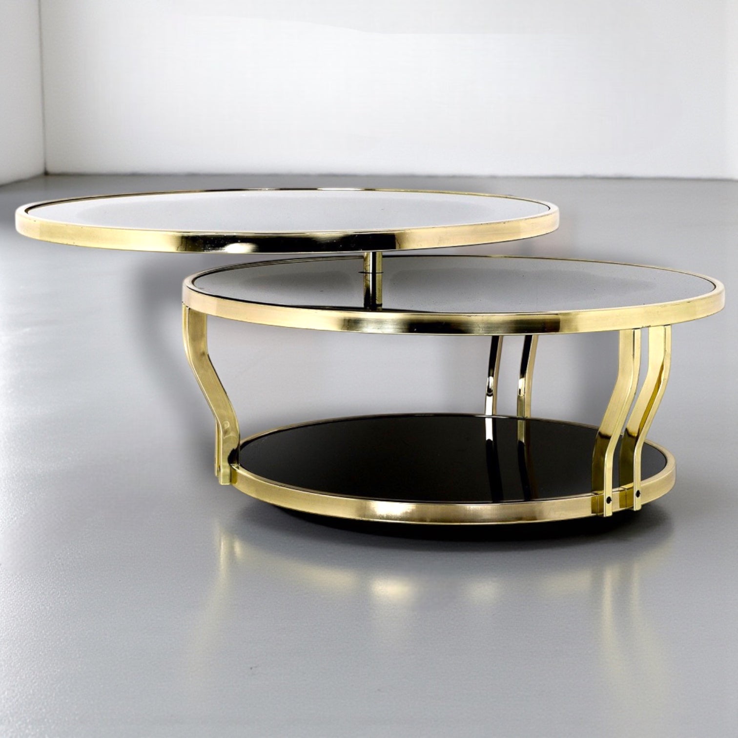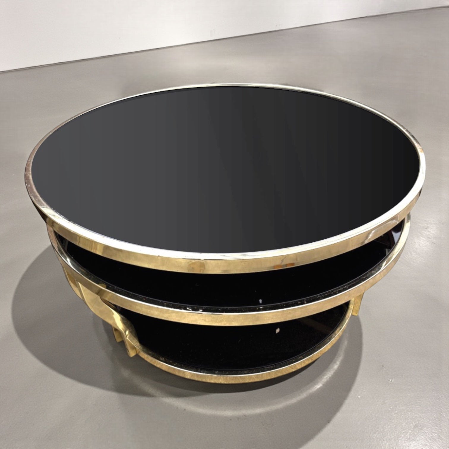 1980s brass and black glass swivel coffee table inspired by Milo Baughman's Hollywood Regency aesthetic. Each of the two circular tiers rotates independently, to configure the table as a compact round form or an extended sculptural piece. Features brass-plated steel frames, smoked glass tops, and a sturdy three-arm base. Approximately 92 cm diameter per tier, 38–39 cm height, extending to 140 cm when fully opened.